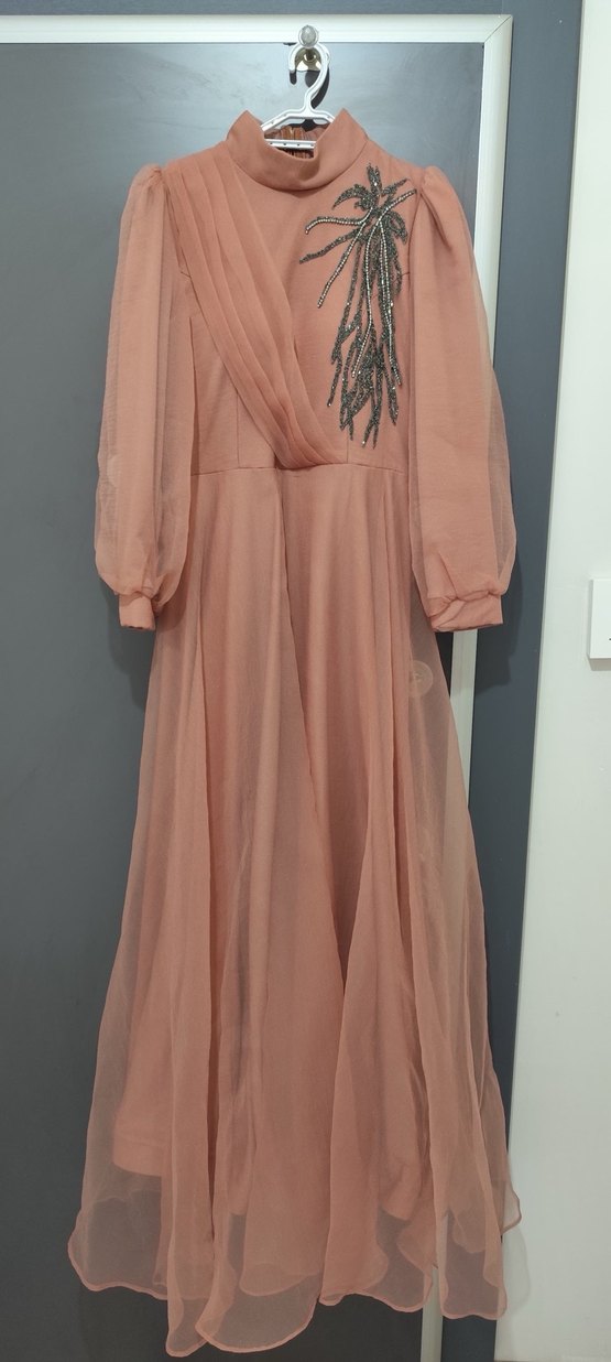 Bej renkte, nakış detaylı, uzun kollu, tekne yaka ve bol kesim bohem tarzda uzun kadın elbisesi. Düğünler için klasik ve zarif bir seçenek.