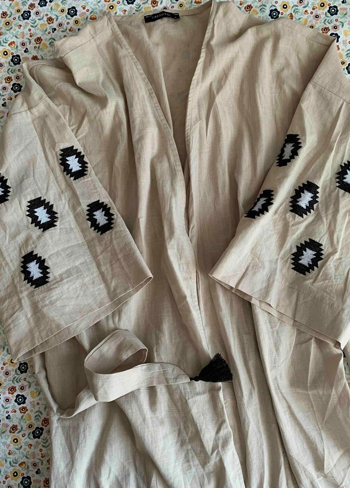 Bej renkte, nakışlı desenlere sahip uzun kollu bohem kimono. Düğmeli, bol kesim ve kesik yakalıdır, günlük kullanıma uygundur.