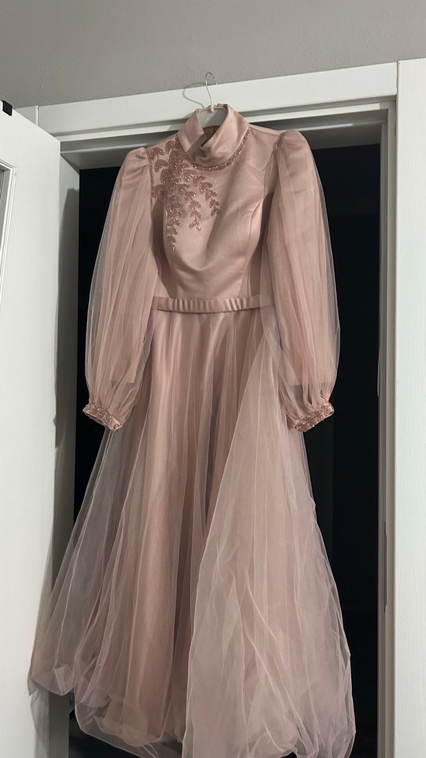 Bej renkte, yüksek yakalı ve uzun tül kollu nakış detaylı abiye elbise. Belden oturan, drapeli ve uzun etekli, düğünler için uygun.