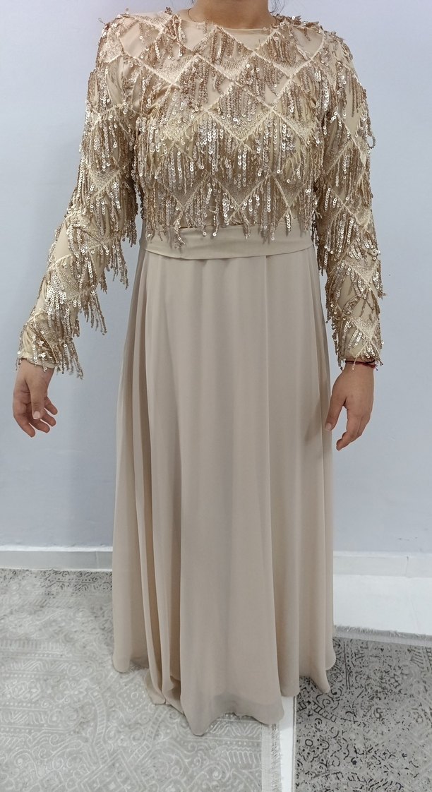Bej renkli, nakışlı ve drapeli detaylara sahip uzun kollu, bol kesim kadın abiye elbise. Düğünler için uygun klasik şıklık sunar. ✨ boy 140 cm omuz arasi 36 cm beden 42