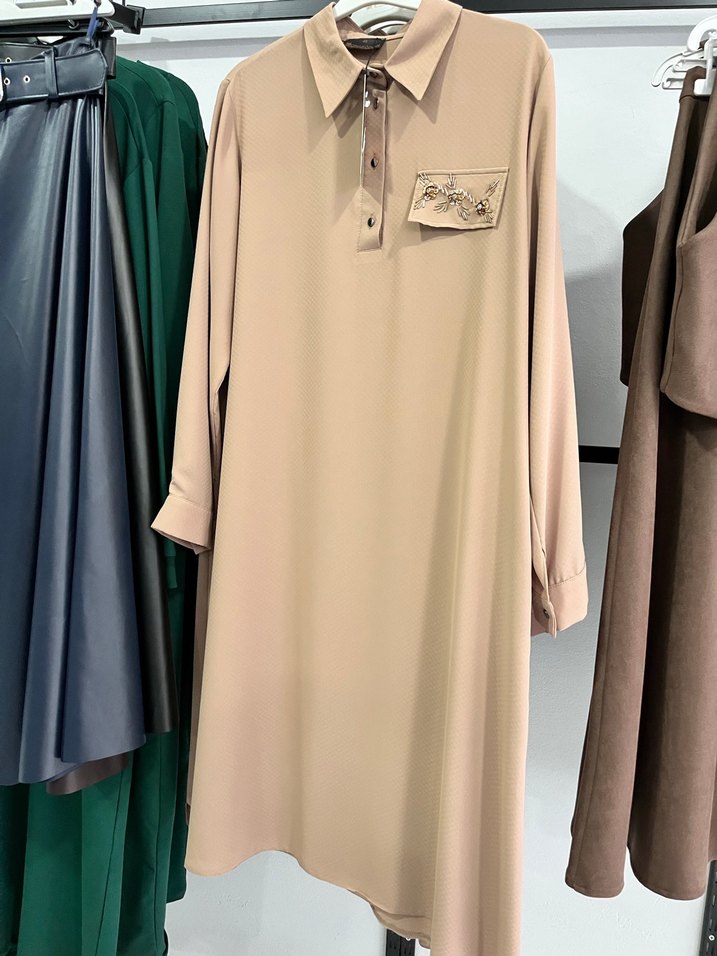 Bej renkte, uzun kollu, yakalı ve düğmeli önü olan uzun kesim tunik. Göğüs cebinde nakış detaylı, bol kesim ve yumuşak sentetik kumaştan üretilmiştir. 48 42 44 50 52 bedenleri mevcuttur siyah rengi de vardır pazarlığa açığız.