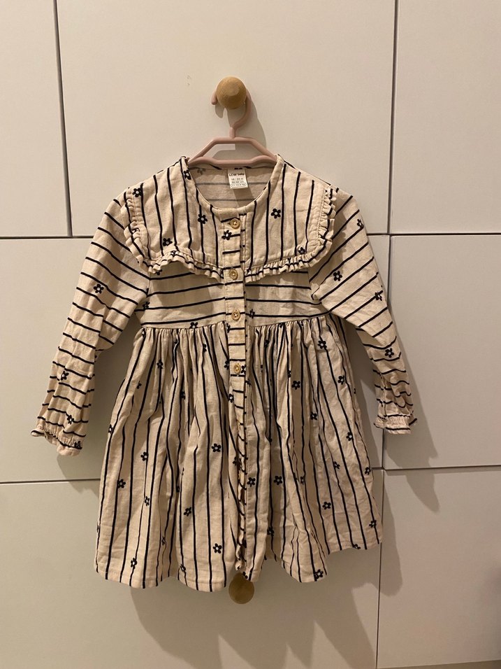 Bej Nakışlı Uzun Kollu Kız Elbise