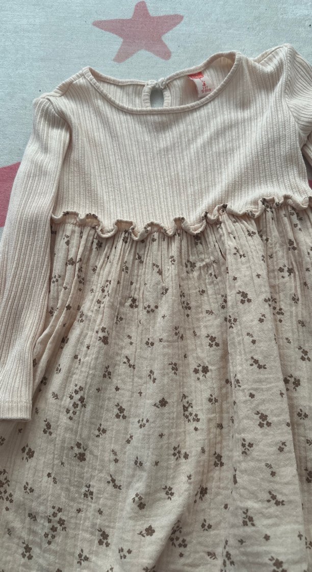 Bej renkli, uzun kollu, yuvarlak yakalı, nakışlı ve fırfırlı detaylara sahip bol kesim kız elbisesi. Bohem tarzda.