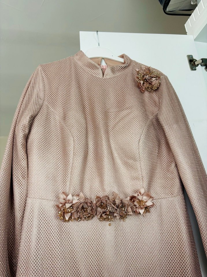 Bu bej renkli, uzun kollu, nakışlı nişan elbisesi, modern klasik tarzda ve parlak görünümlüdür. Düğmeli detayları ve çiçek süslemeleriyle vintage dokunuş sunar.