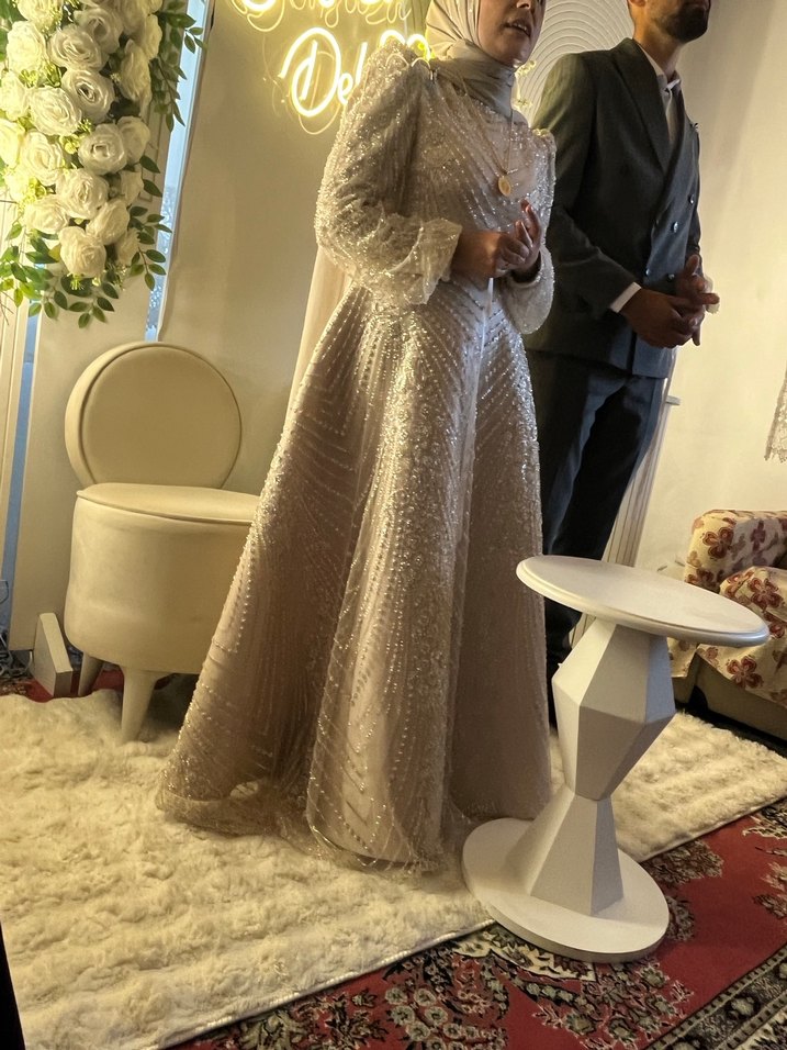 Bej renkli, yüksek yakalı ve uzun kollu nakışlı nişan elbisesi. Düzenli kesim ve drapeli, modern klasik tarzda, gösterişli düğünler için uygundur. Özel tasarım bi defa evde sözde giydim çok temiz