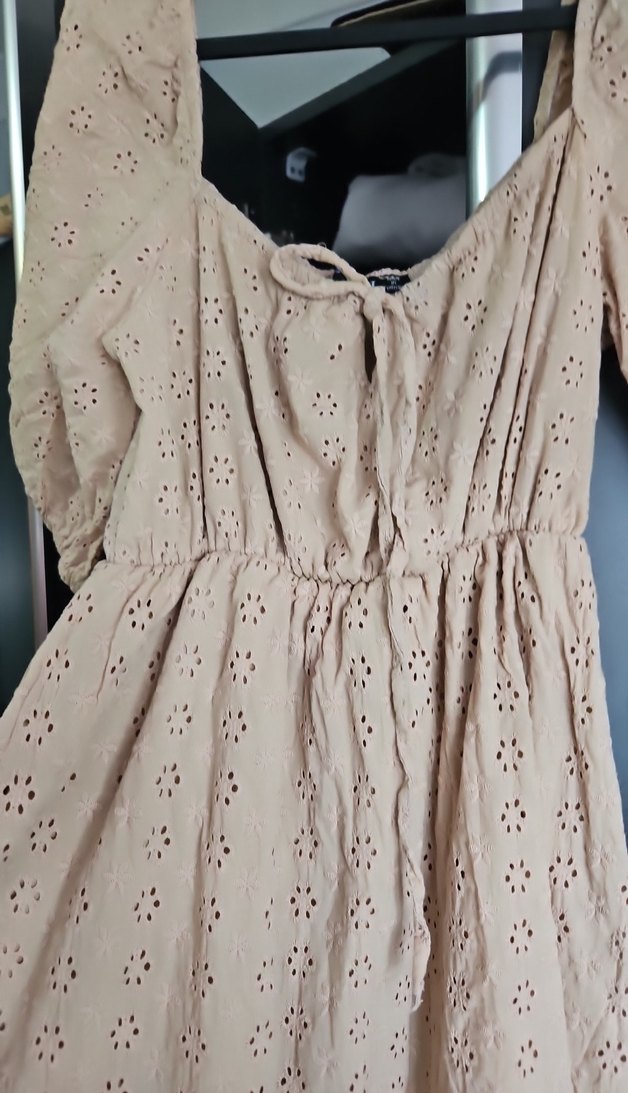 Yumuşak keten kumaştan, nakışlı desenlere ve fırfırlı V yakaya sahip elbise Bohem tarzda, kollarıyla günlük kullanıma uygun.