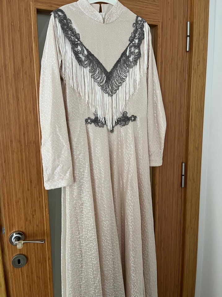 Bej renkli, nakış detaylı ve gri püsküllü uzun bohem elbise. V yaka ve uzun kollu, rahat kesimle düğünler için uygundur. Ablamın kınasında sadece 1 kere giyildi astarı likralı hareket etmekte rahat elbise