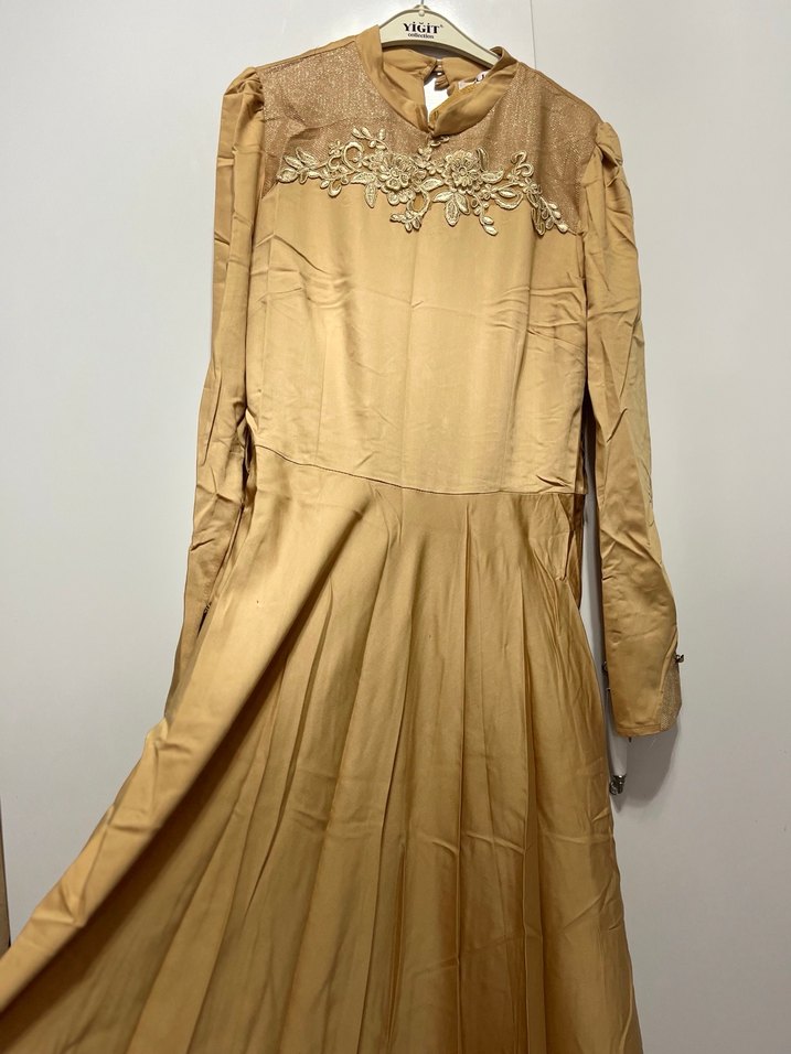 Bej renkli, yüksek yakalı ve uzun kollu vintage uzun abiye. Göğüs kısmında nakış detayı, dökümlü ve bol kesim, parlak yüzeyli, düğünlere uygun.
