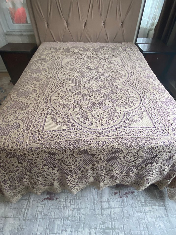 bej renkte, detaylı nakış işlemeli yatak örtüsü, yatak odasına zarif ve ince bir dokunuş katıyor. Dantel Anglez tamamen elişi antika