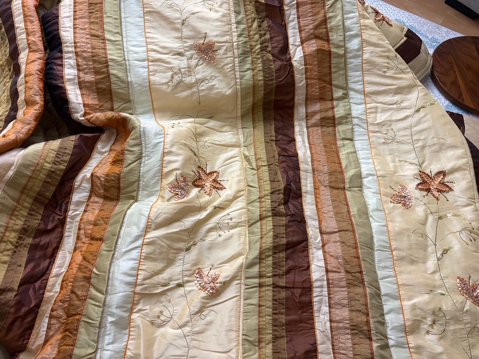 Bej renkte, nakışlı çiçek desenleri ve çizgili detaylara sahip yatak örtüsü. Yumuşak ve şık bir görünüm sağlar. ️