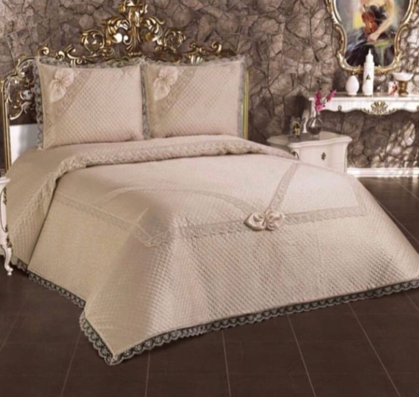 Bej renkli, pastel tonlarda, nakış detaylı ve dokulu desenli yatak örtüsü, üzeri dekoratif fiyonklarla süslenmiştir. ️ Alfima Fransız dantelli 3 parça yatak örtüsü 230×240 cm
