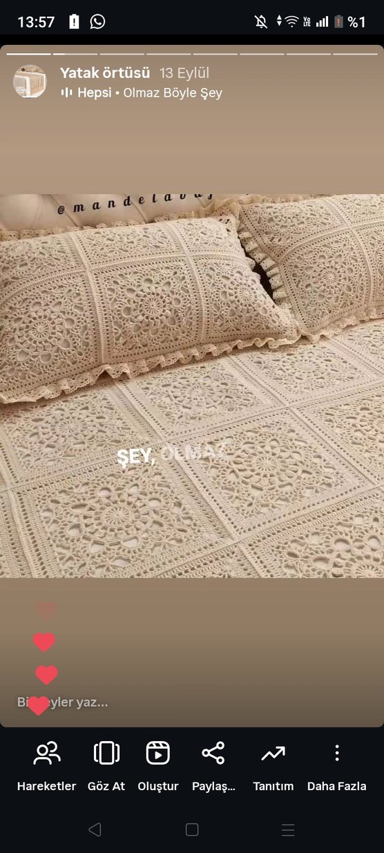 Bu bej yatak örtüsü, detaylı nakışlı desenlere sahip olup pastel tonlarda yumuşak ve zarif bir dokunuş sağlar. ️ yapımı 6 aydr Fiyatı 65 bin₺