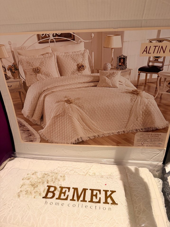 Bej renkte, nakış işlemeli yatak örtüsü seti. Pastel tonlarda, BEMEK homecollection markasına ait, ALTIN etiketiyle. ️