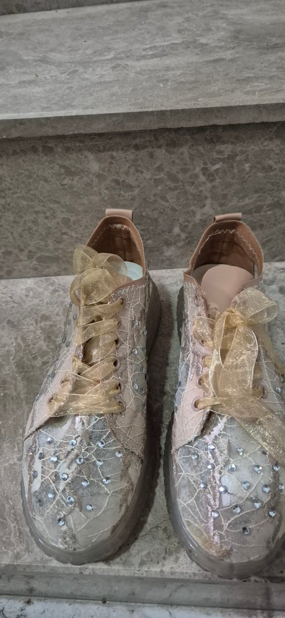 Nakışlı detaylara ve dantel bağcığa sahip bej yüksek topuklu kadın spor ayakkabısı, sentetik kumaştan üretilmiştir. Şık sokak tarzı için uygundur.