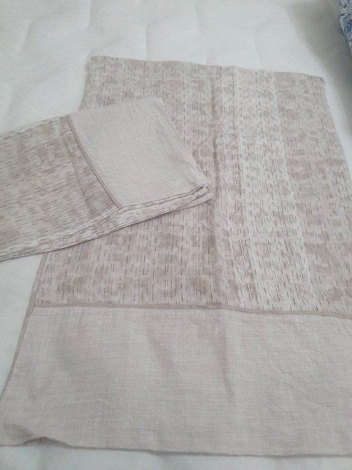 Bej ve gri renklerde, desensiz yumuşak dokulu nevresim takımı sadece 2 yastık 1 yorgan astarı vardır carşaf yoktur