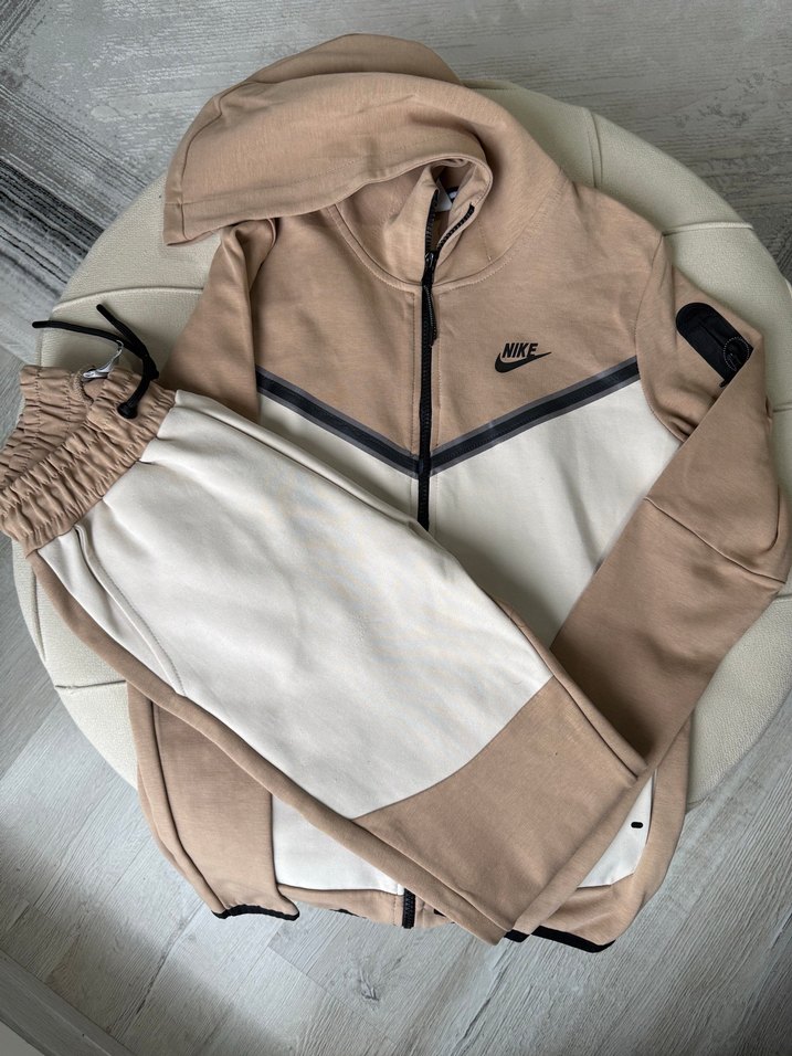 Bej renkli, uzun kollu, fermuarlı ve yuvarlak yakalı Nike kadın mini eşofman takımı, yumuşak sentetik kumaştan üretilmiştir.