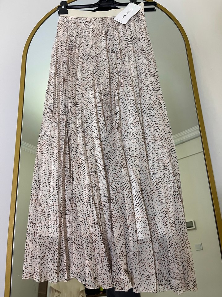 Bej renkte, nokta desenli pilili uzun etek. Rahat kesimli ve sentetik yumuşak kumaştan üretilmiştir. Bohem Paris tarzını yansıtarak açık hava kullanımı için uygundur.