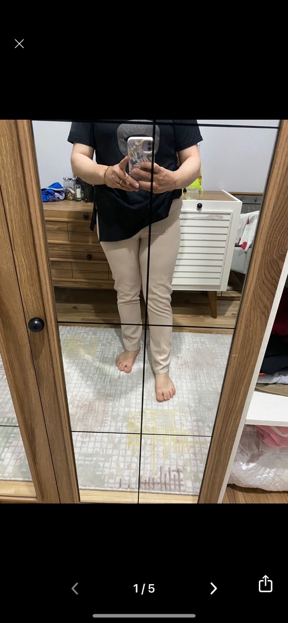 Bej renkli, normal boy ve dar kesim hamile pantolonu, hafif yırtmaç detayı ve yumuşak sentetik kumaşla günlük kullanım için uygundur. Defosu var