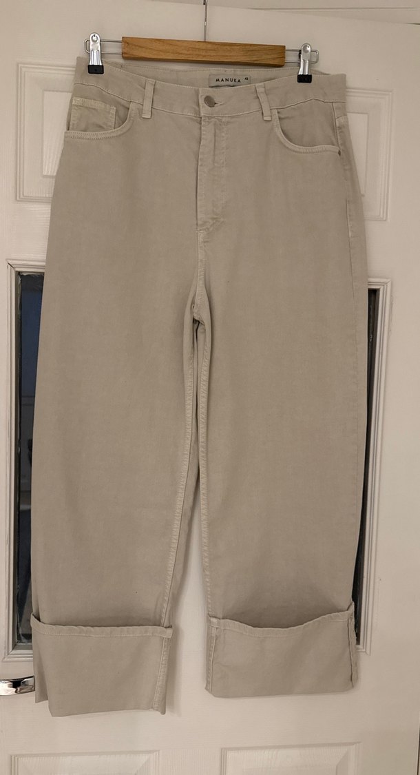 Bej renkte, normal boy ve regular fit kesime sahip kot pantolon, günlük kullanıma uygun sade ve rahat bir stil sunar.
