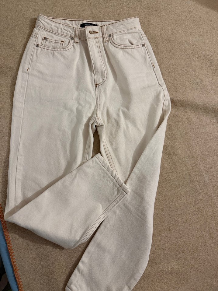 Bej renkte, pamuk kumaştan yapılmış, normal boy ve regular fit kadın kot pantolon. Günlük kullanıma uygun, sade ve şık görünümlü.