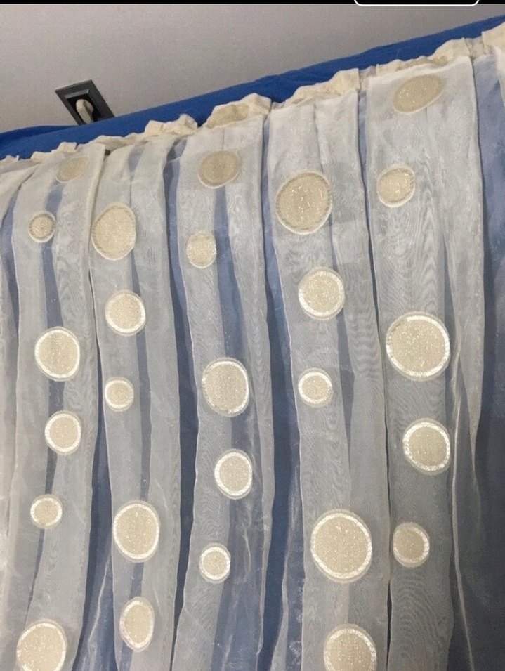Yeni gibi, şeffaf kumaştan, nakışlı dairesel desenlere sahip krem rengi bohem tarzı perde. ölçü en 2.35 cm boy 2 metre dir