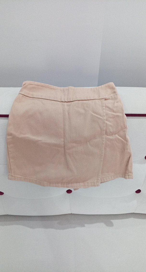 Bej renkte, dar kesim ve düz desensiz kız çocuk eteği, rahat sentetik kumaştan, günlük sokak stiline uygun.