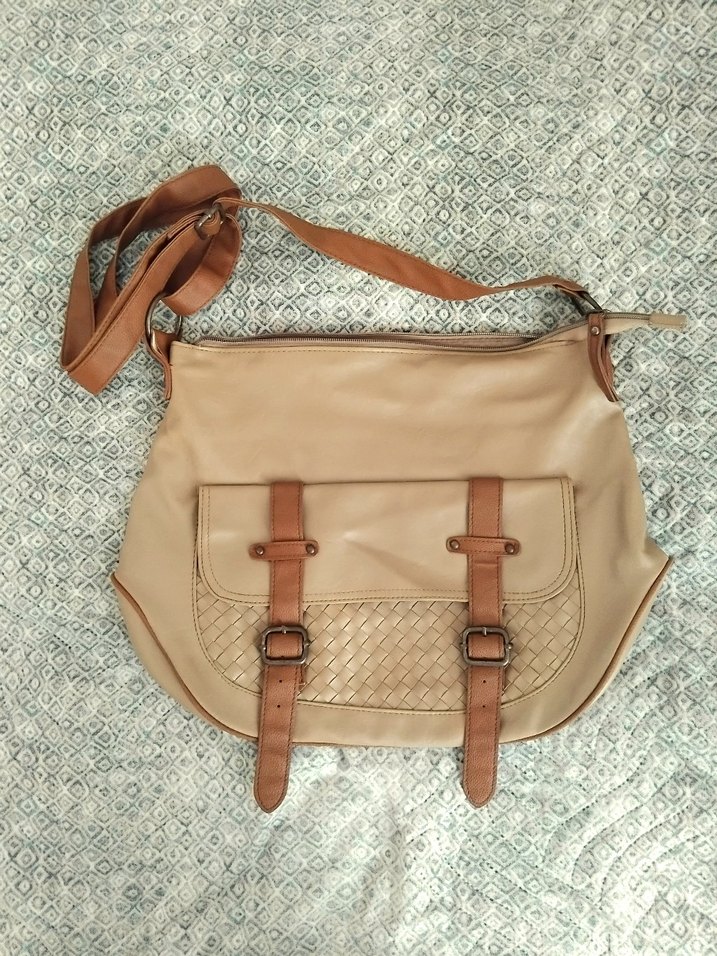 Bej renkli, tokalı kayışlı ve ön cepli deri kadın çantasıdır. Toka renkleri aşınmıştır, derisinde de minik bir kusur bulunuyor, fotoğraflarda görebilirsiniz.