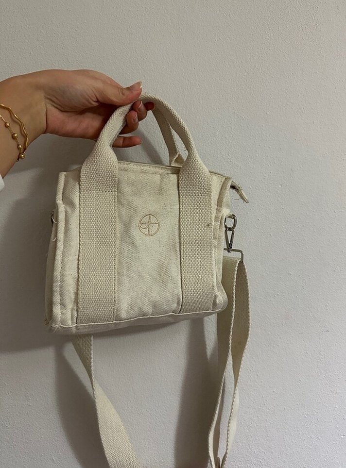 Beyaz pamuk kumaştan, minimal baskılı desenli, kısa saplı ve çıkarılabilir askılı günlük çanta.