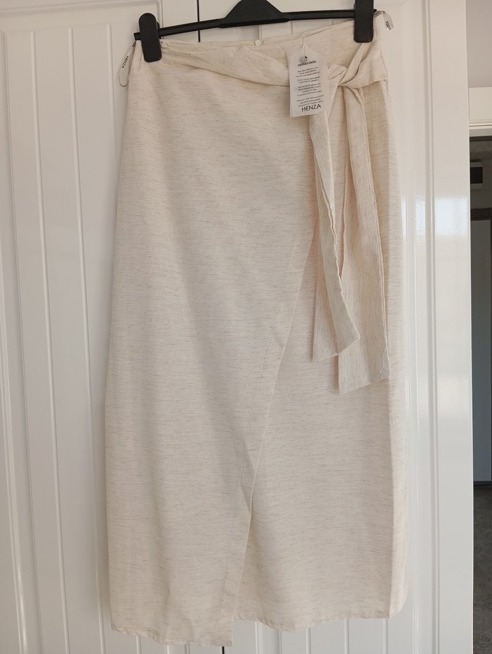 Düz dokulu, açık bej renginde, modern tarzda hafif bir etek hiç giyilmedi ürün etiketli bedeni uymadığı için satıyorum