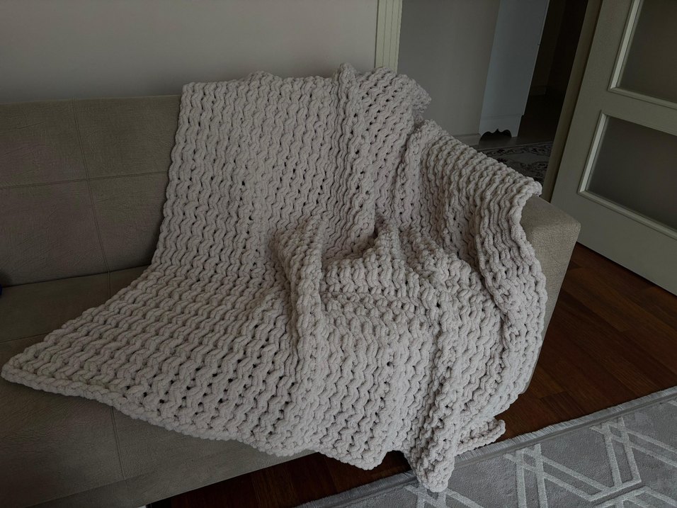Yumuşak dokulu bej örgülü battaniye, sıcaklık ve rahatlık sağlar.
