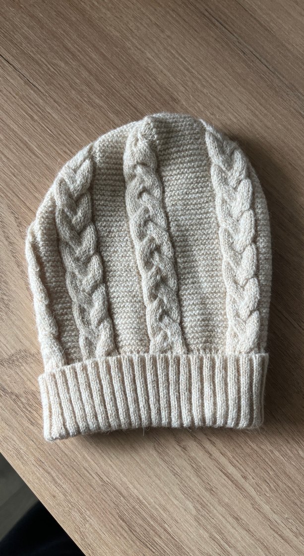 bej renkli, örgüden yapılmış ve örgü desenlere sahip bere. Rahat, yumuşak dokulu bir bebek ürünü