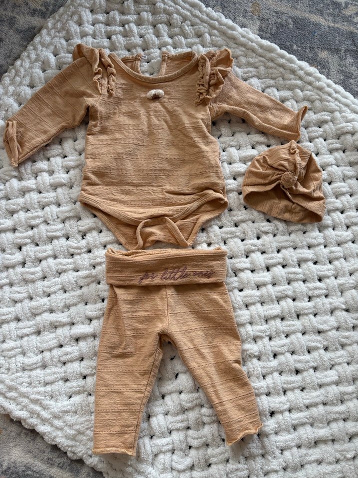 Uzun kollu, fırfırlı detaylı bej örgü üst, uyumlu tayt ve yumuşak şapka içeren pastel tonlarda bebek kız takımı. 0-3 ay