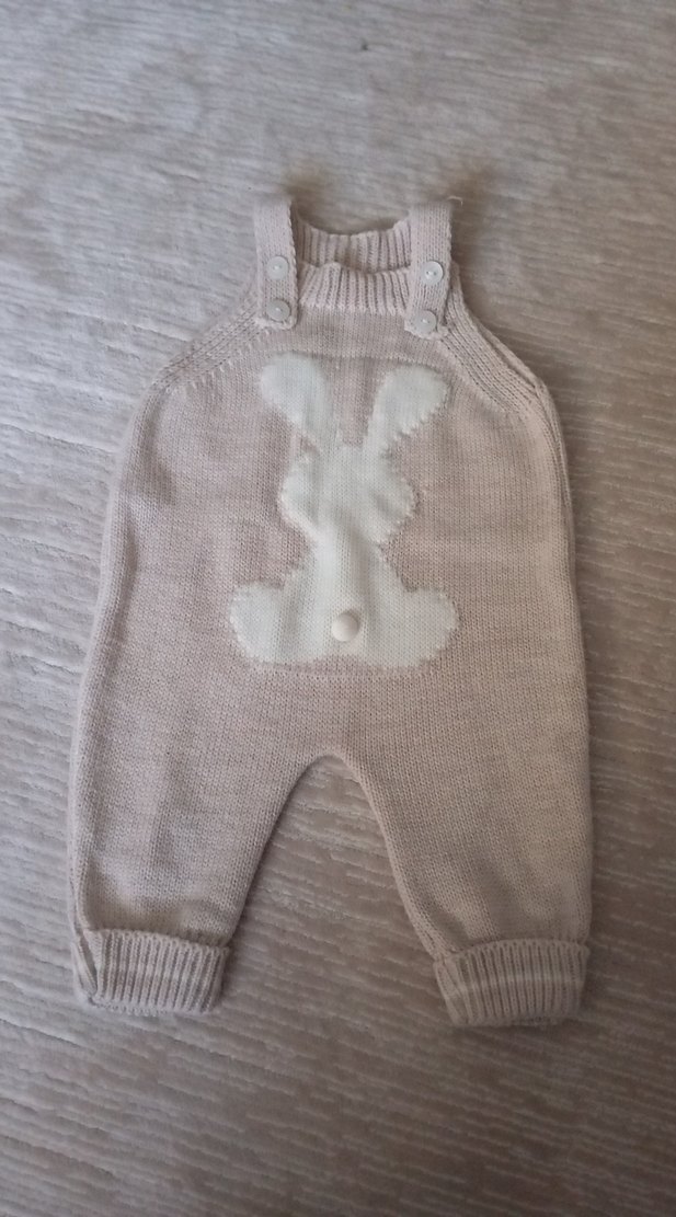 Bej renkli, örgü kumaştan yapılmış, kolsuz ve bisiklet yaka tulum. Önünde yumuşak bir tavşan deseni bulunur.
