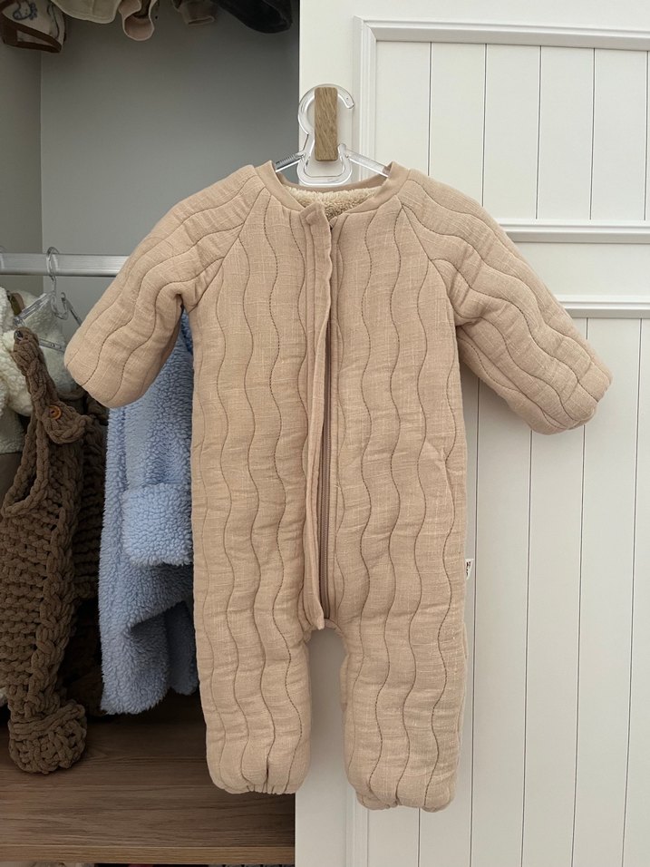 Bej renkli, örgü dokulu keten kumaştan yapılmış bebek tulumu. Düz desensiz, kolay giydirme için ön fermuarlı.