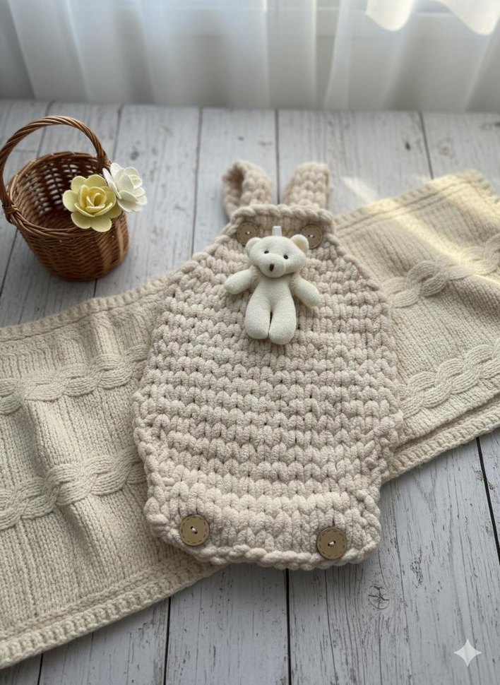 Ayıcık detaylı, bej renkli, örgü kumaştan yapılmış, askılı ve yuvarlak yakalı bebek tulumu. Bohem tarzda, rahat ve şık.