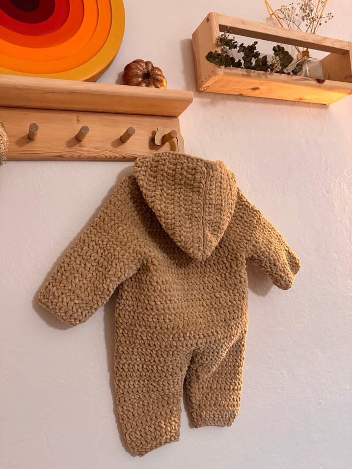 Kapüşonlu, kalın örgü dokusuyla kahverengi bebek tulumu, sıcak ve rahat bir kullanım sunar. Desensiz ve normcore tarzındadır.