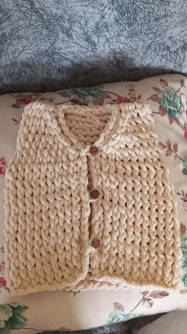 Bej renkli, salaş kesim, el örgüsü kalın dokuma bebek yeleği, ahşap düğmeli, bohem tarzı için uygun.