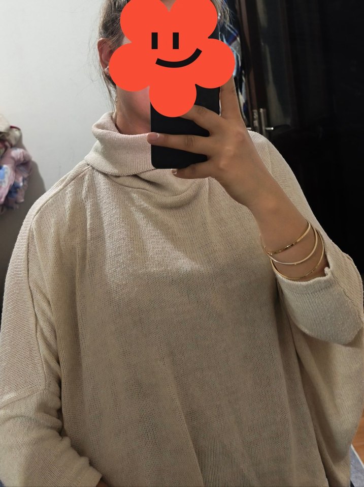 Bej renkli, yumuşak yün örgüden yapılmış, bol kesim boğazlı ve uzun kollu kadın kazak. Orta uzunlukta ve desensiz, rahat sokak stili için uygun.