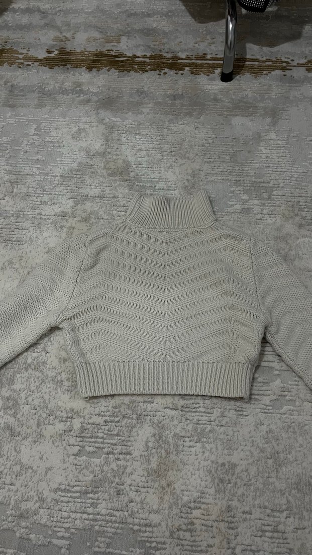 Bej renkli, örgü dokulu, boğazlı ve uzun kollu, kısa kesim, rahat ve şık kadın kazak. Sokak stiline uygun, rahat bir tasarıma sahip.