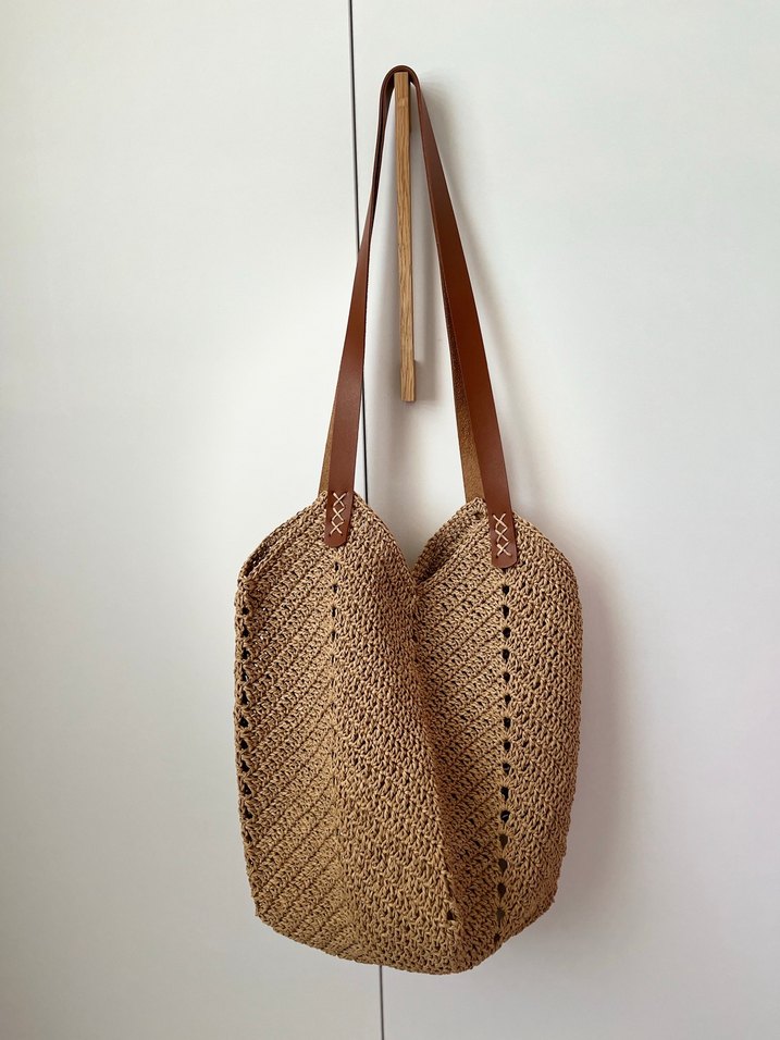 Bej örgü kağıt ipten yapılmıştır, model detaylı ve kahverengi saplı bohem tarzda kadın çantası. Günlük kullanıma uygun, açık renk ve desensiz.