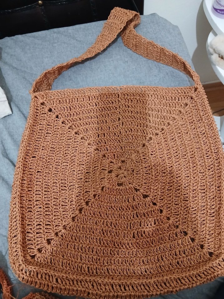 Bej renkli, dantel görünümlü örgü desene sahip, geniş askılı bohem tarzda kadın çantası.