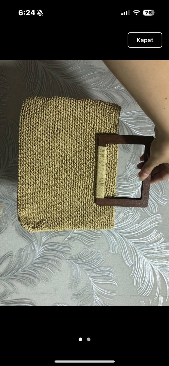 Bej renkli, parlak dokulu örgü kadın çanta, ahşap saplı ve günlük kullanıma uygun bohem tarzda.