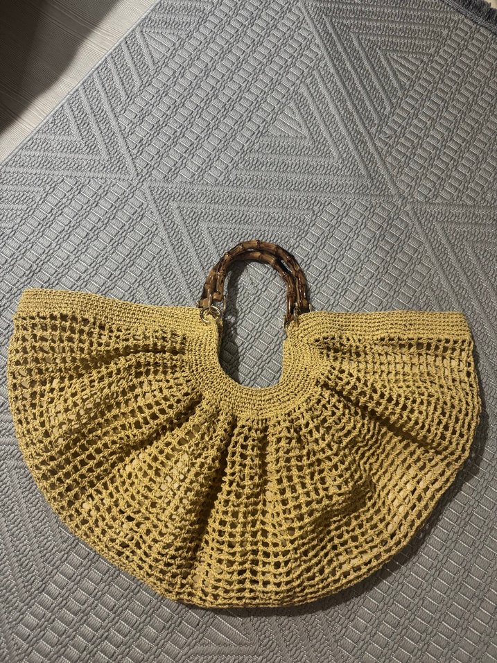 Bambu saplı, havadar ve geniş tasarımlı bej örgü bohem kadın çanta. Günlük kullanım için uygun.
