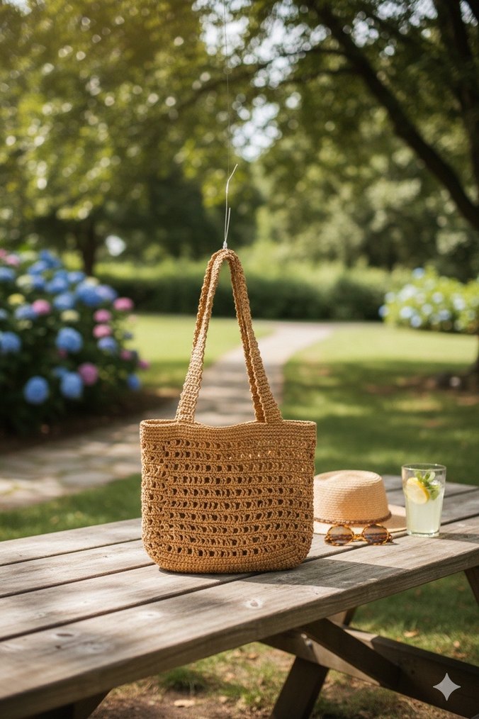 Bej renkli, dantel detaylı örgü kadın çanta. Minimalist bohem tarzda, açık hava kullanımı için uygun, desensiz ve hafif yapısıyla retro ve hippie stillerine uyum sağlar.