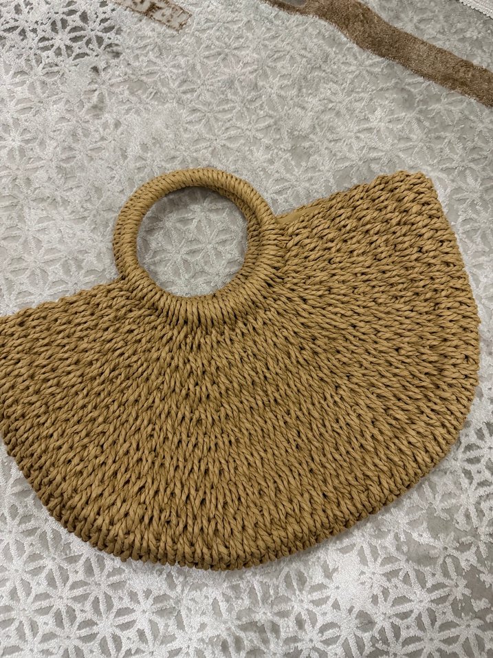 Yuvarlak saplı, bohem tarzda bej örgü kadın çanta. Nakışlı detayları ve dantel görünümlü dokusuyla günlük kullanıma uygun.