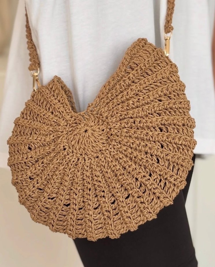Bej renkte, örgü yapılı bohem tarzda kadın çantasıdır. Yarım daire formunda ve günlük kullanıma uygundur. Rahat omuz askısı bulunur.