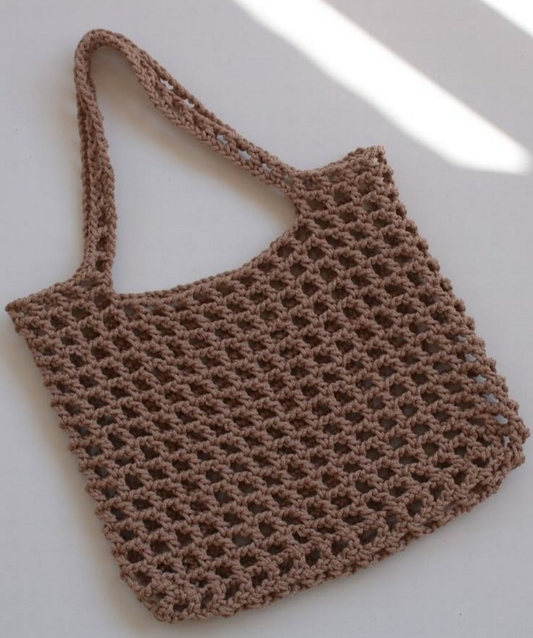 Bej renkli, dantel görünümlü açık örgü tasarıma sahip, minimalist ve bohem tarzda günlük kullanıma uygun kadın çantası.