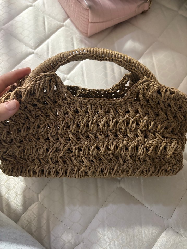 Bej renkli, örgü dokulu, bohem tarzda kadın çantası. Günlük kullanıma uygun, desensiz ve retro havası taşıyan bir model.