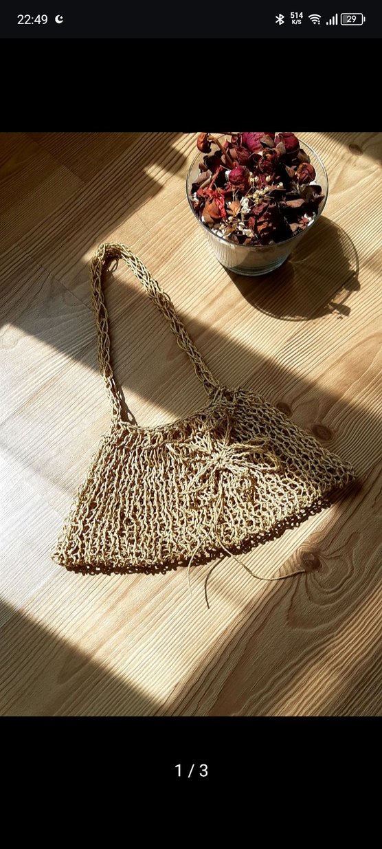 Parlak bej renkte, yumuşak örgü kumaştan yapılmış bohem tarzda kadın çantası. Günlük kullanıma uygundur.