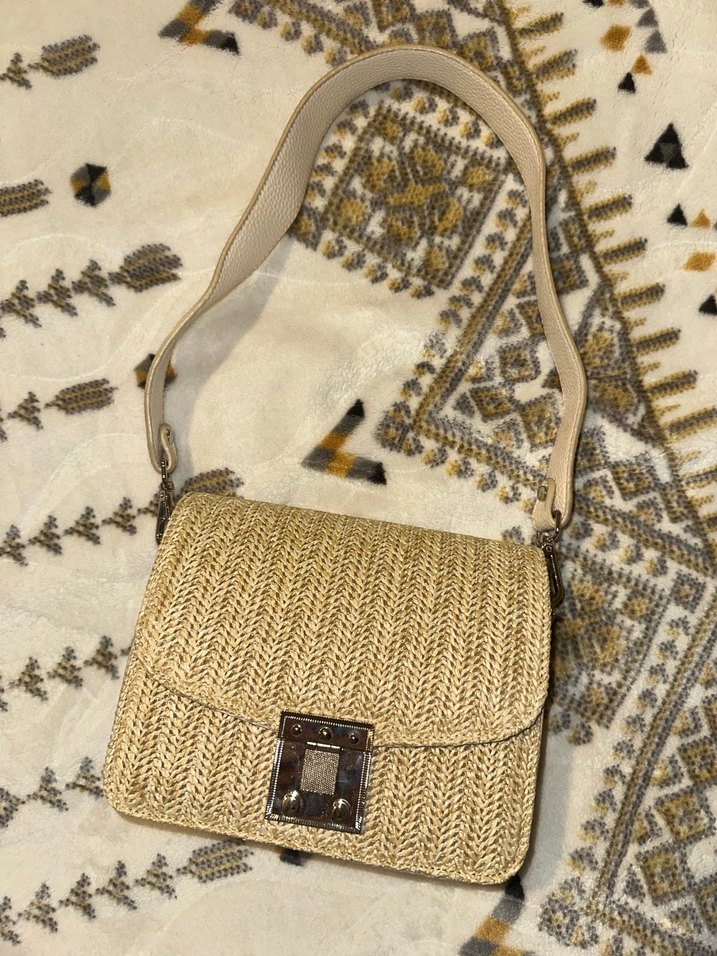 Bej renkli, örgü dokulu, tokalı kapaklı ve yılan desenli bu kadın çantası, bohem ve Paris tarzını günlük kullanıma sunuyor.